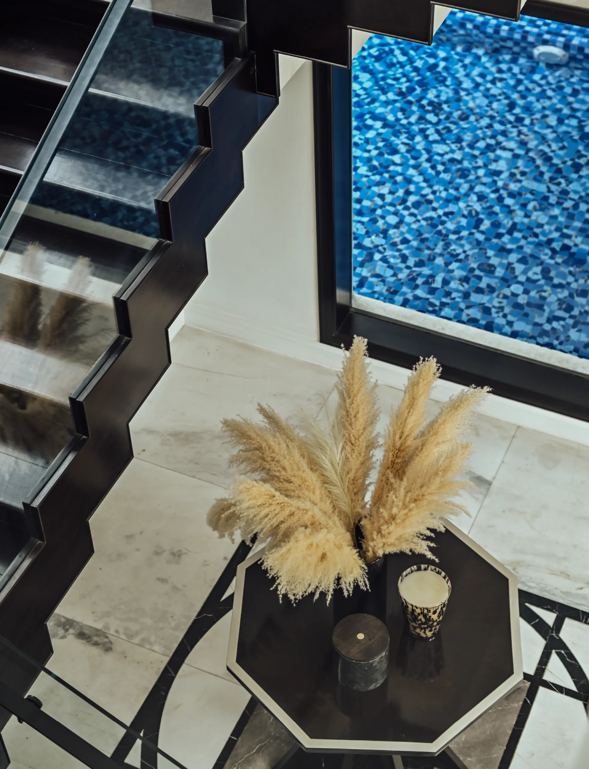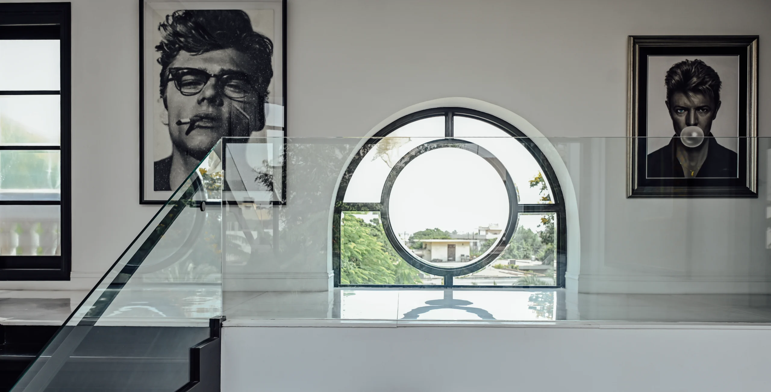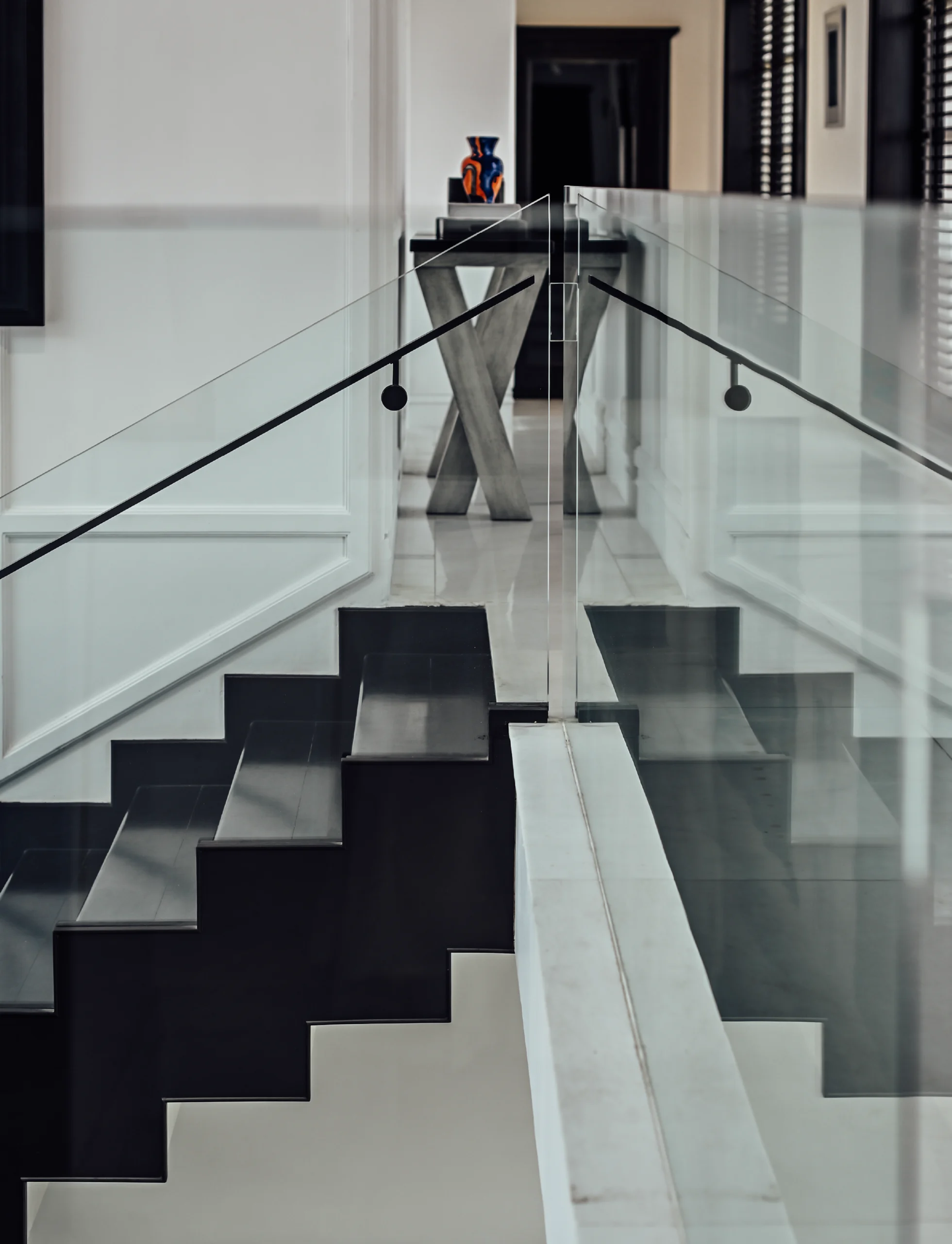 The stairway becomes a quiet gallery-monochrome walls, black-framed windows, and statement art elevating the passage. In the bedroom, sleek black marble meets white-on-white paneling, creating a modern bachelor’s retreat that is minimal, graphic, and deeply personal.