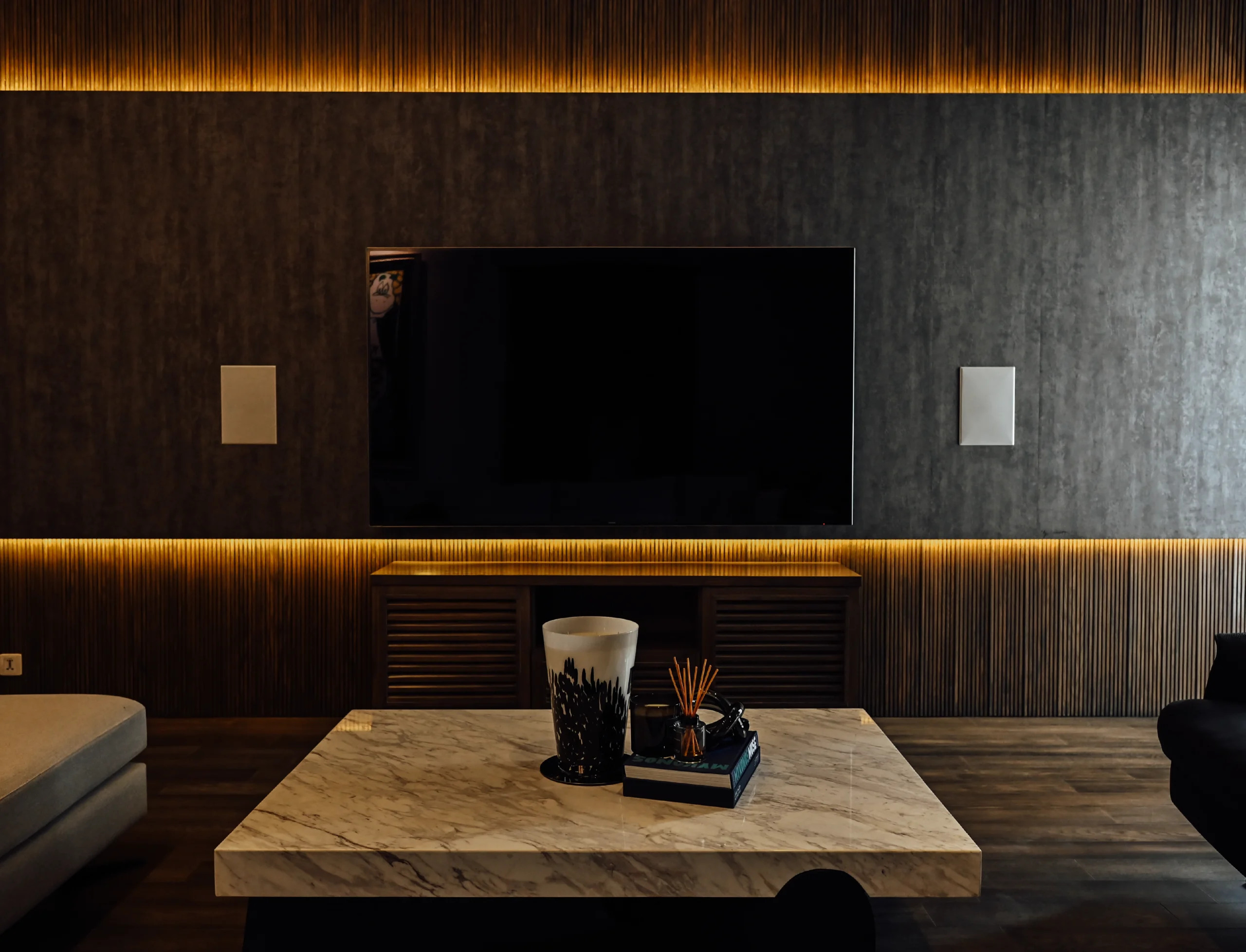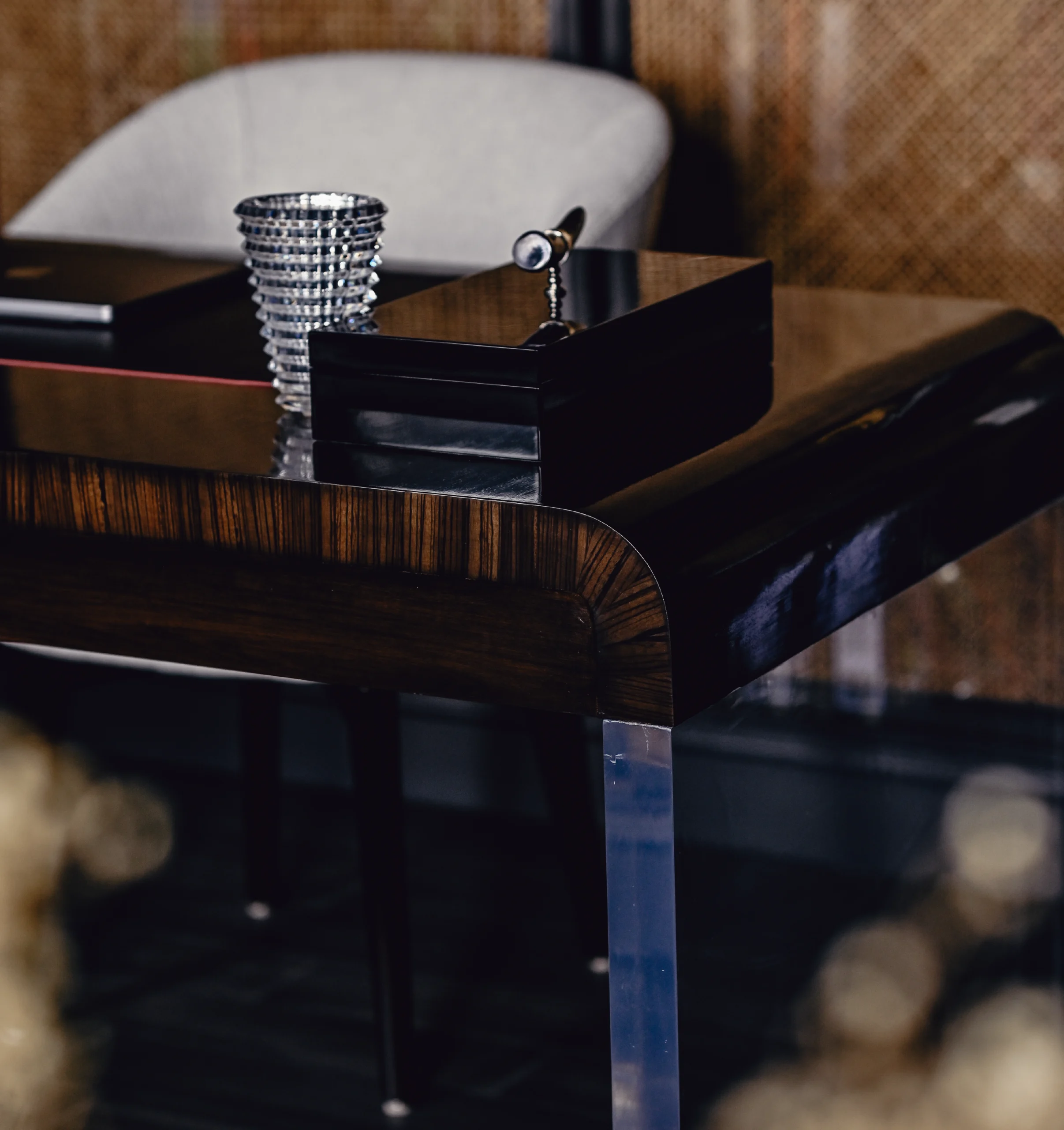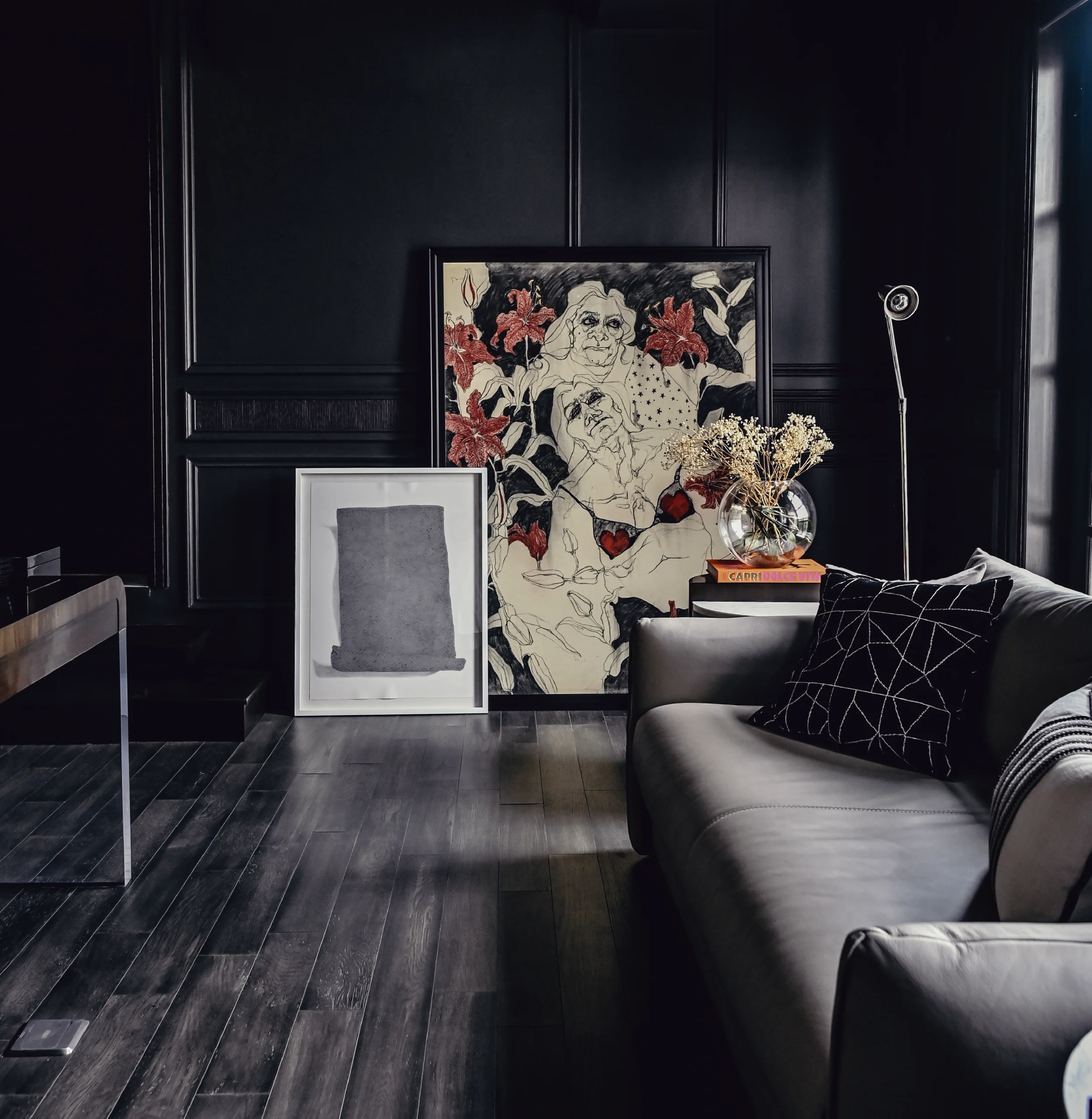 A moody palette of black and white defines this home, where contrast takes center stage. The study is dark and cocooning, layered with black surfaces, warm wood and cane detailing, while a white sofa and chair break the intensity, striking a balance between depth and comfort.