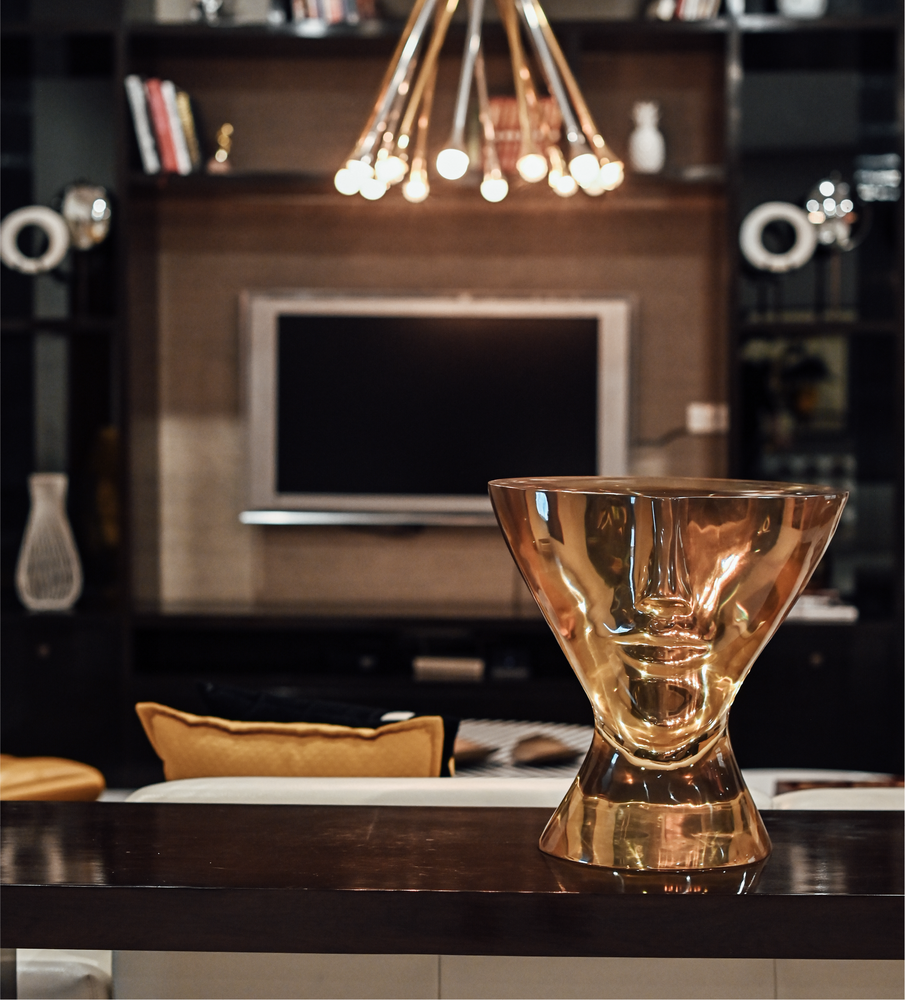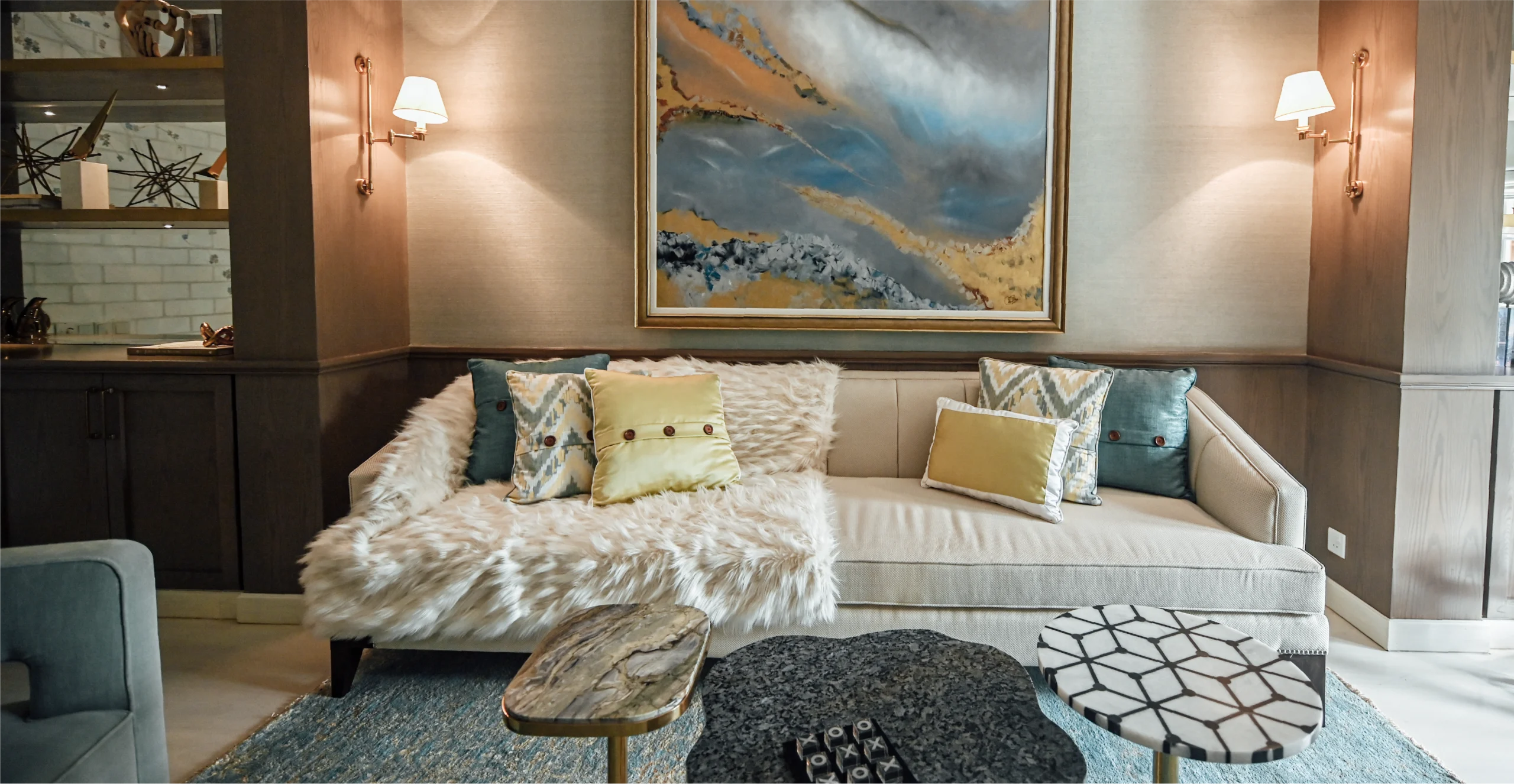 Designed for family gatherings and late night conversations, this lounge layers dark marble, leather and textured greys grounded by shadow and sharpened with brass and gold.