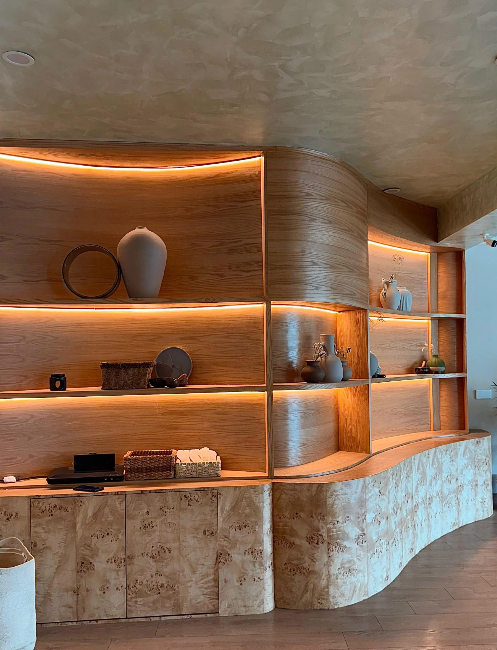 Yoga Lift Studio was conceived as a serene sanctuary, a place that feels like a homecoming for its community. Bathed in natural light, the interior embraces earthy textures and raw finishes, softened by sage green accents that wash across the ceiling and gently envelop the space. The bespoke burl wood unit, with its grounded warmth, anchors the design, while soft natural light accentuates the layered materials. The atmosphere is one of calm balance: brighter, softer, and imbued with a sense of flow, proving that a studio is more than walls and windows; it is energy, feeling and connection.